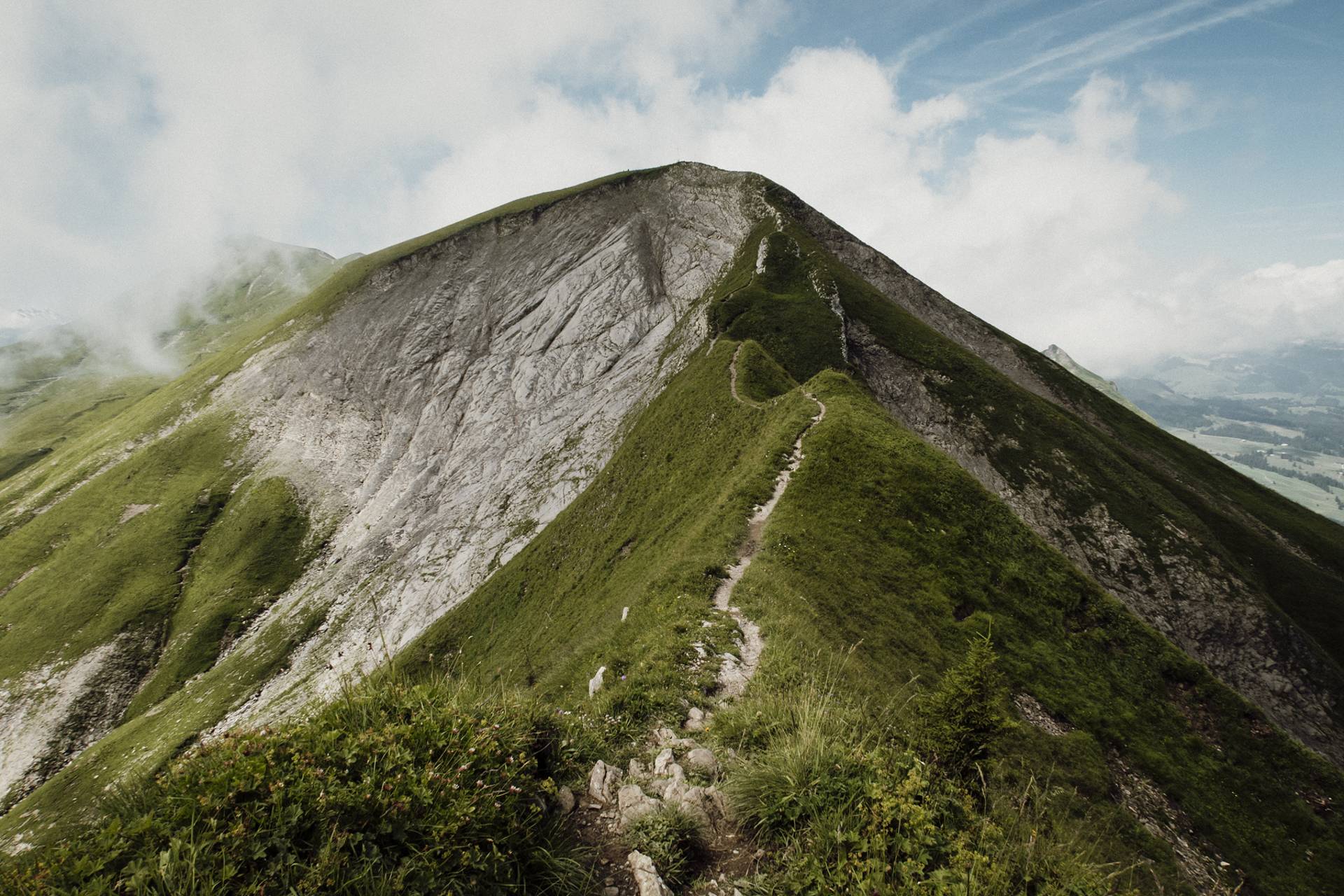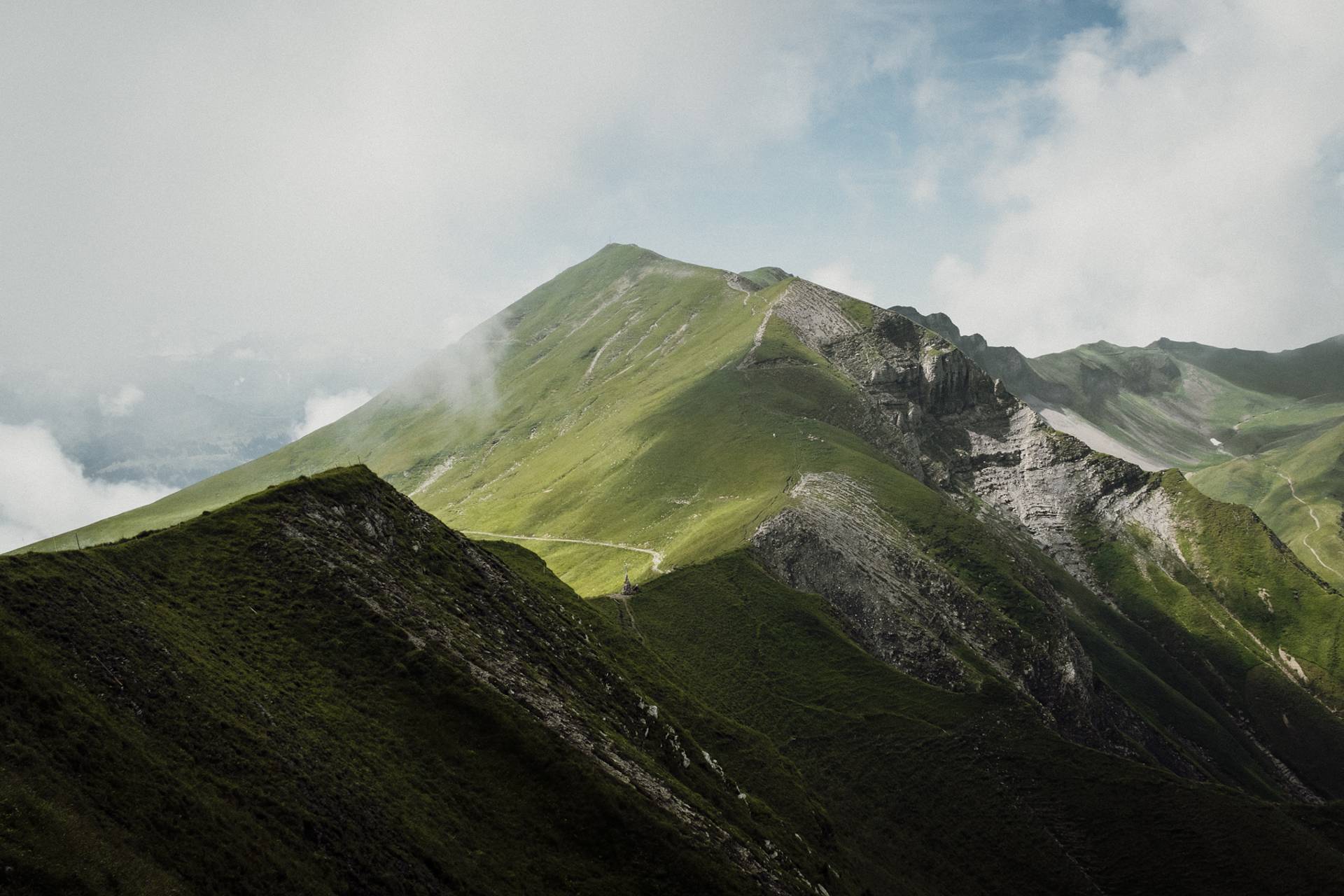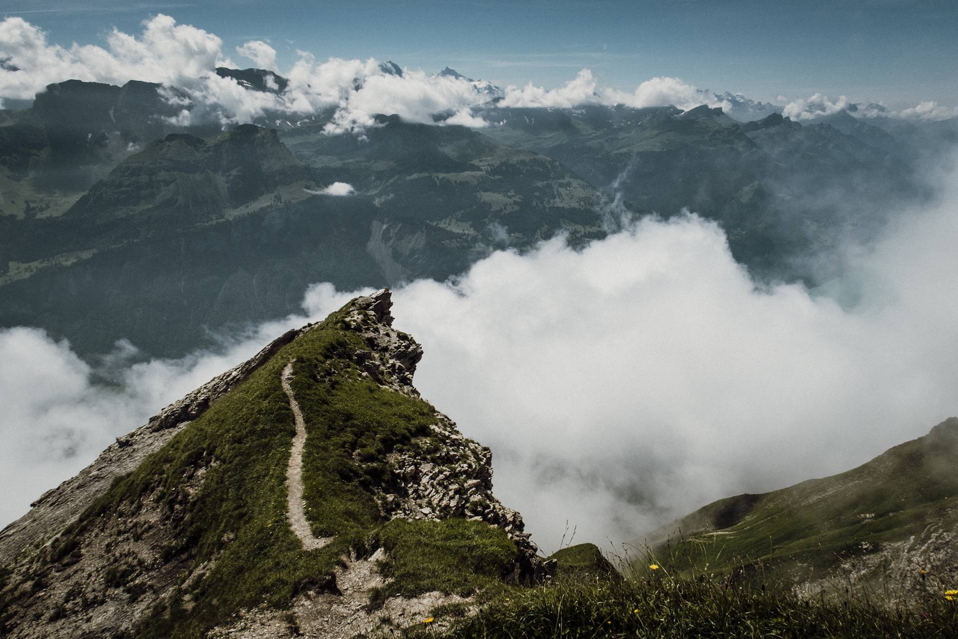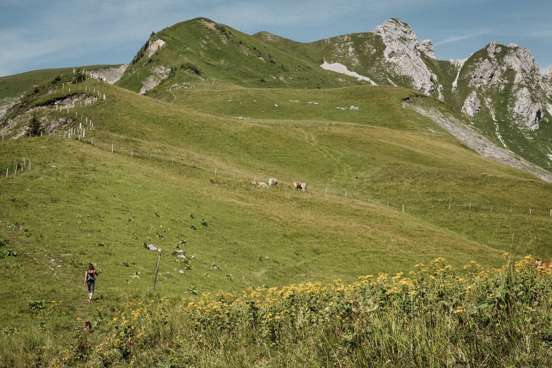 Ici, rien de techniquement difficile mais il faut être en forme car l’itinéraire est plutôt long et le dénivelé positif assez important. Sans parler du fait qu’une fois en haut, on redescend un peu, puis on remonte, puis on redescend, et on remonte encore le long de toutes ces belles petites collines herbeuses. Tout ça pour atteindre 3 petits sommets bombés qui offrent une vue magnifique sur les Alpes bernoises.