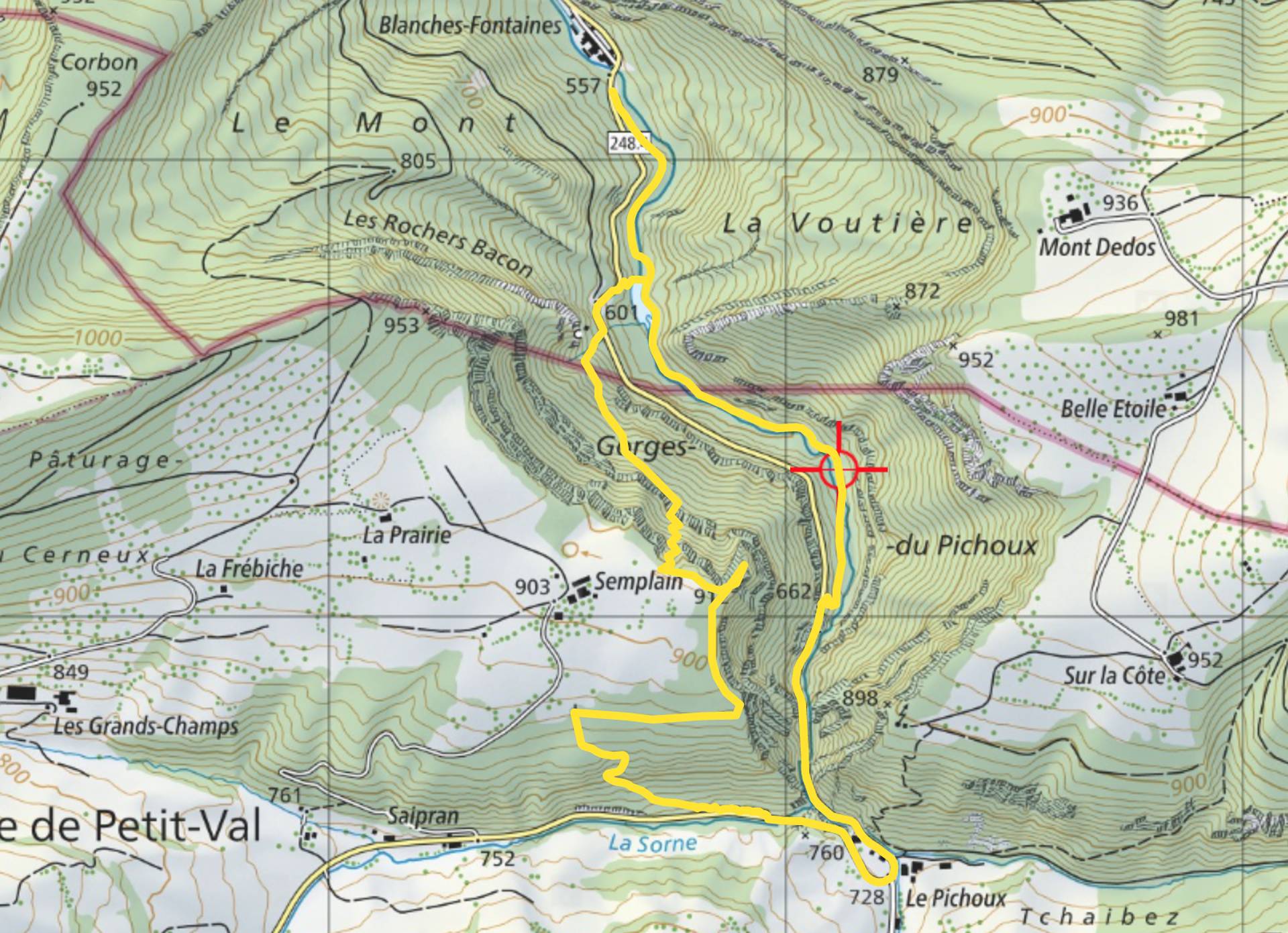 Comme le tracé ne figure pas sur la carte, le parcours que j’ai moi-même tracé peut être un peu approximatif. Dans tous les cas, durant votre randonnée, suivez LE SENTIER et pas nécessairement mon tracé si celui-ci ne correspond pas exactement au sentier.
