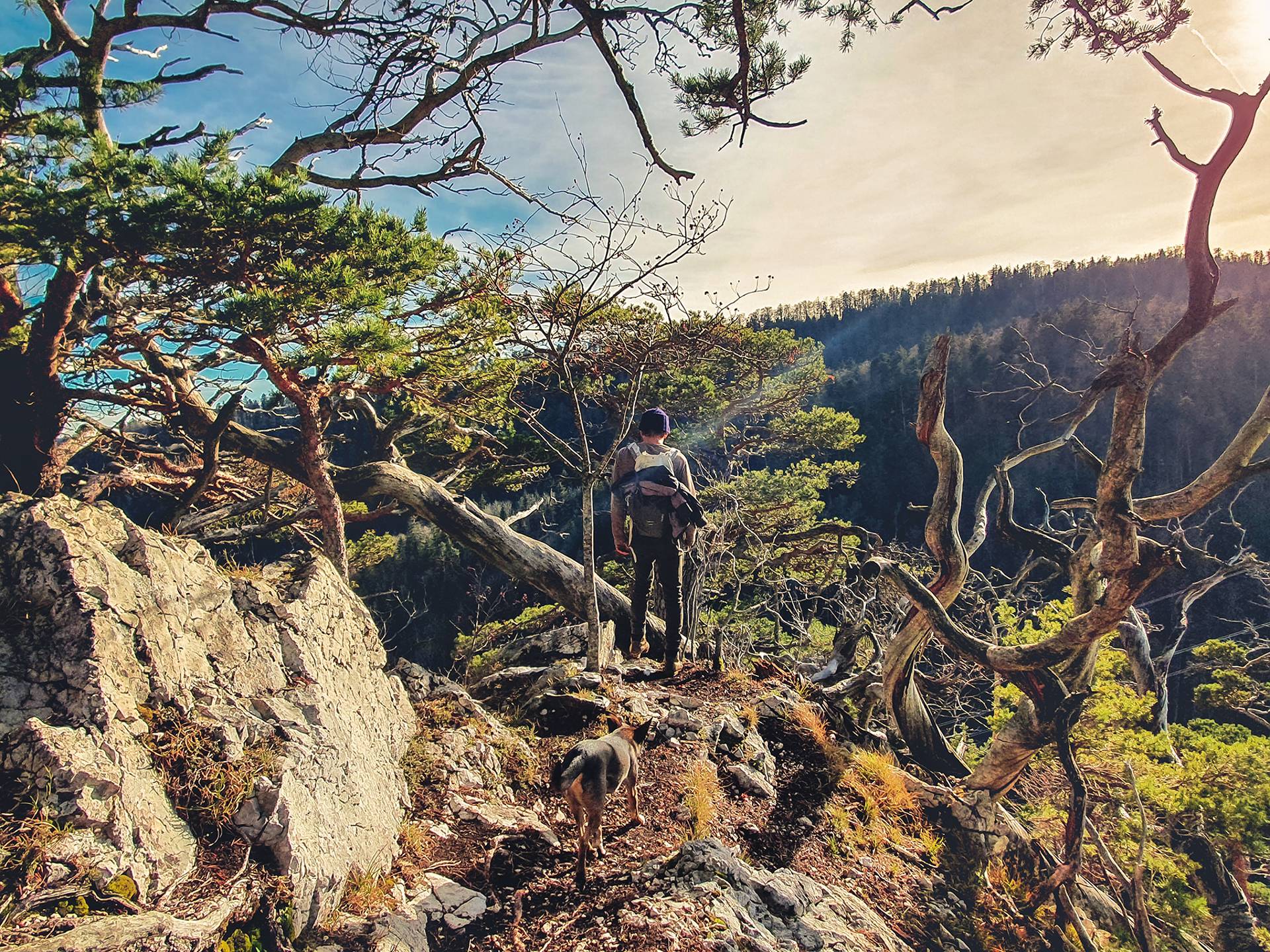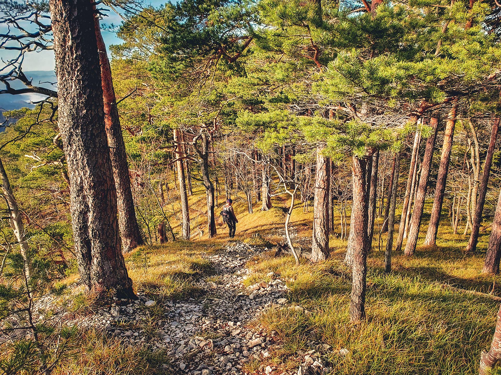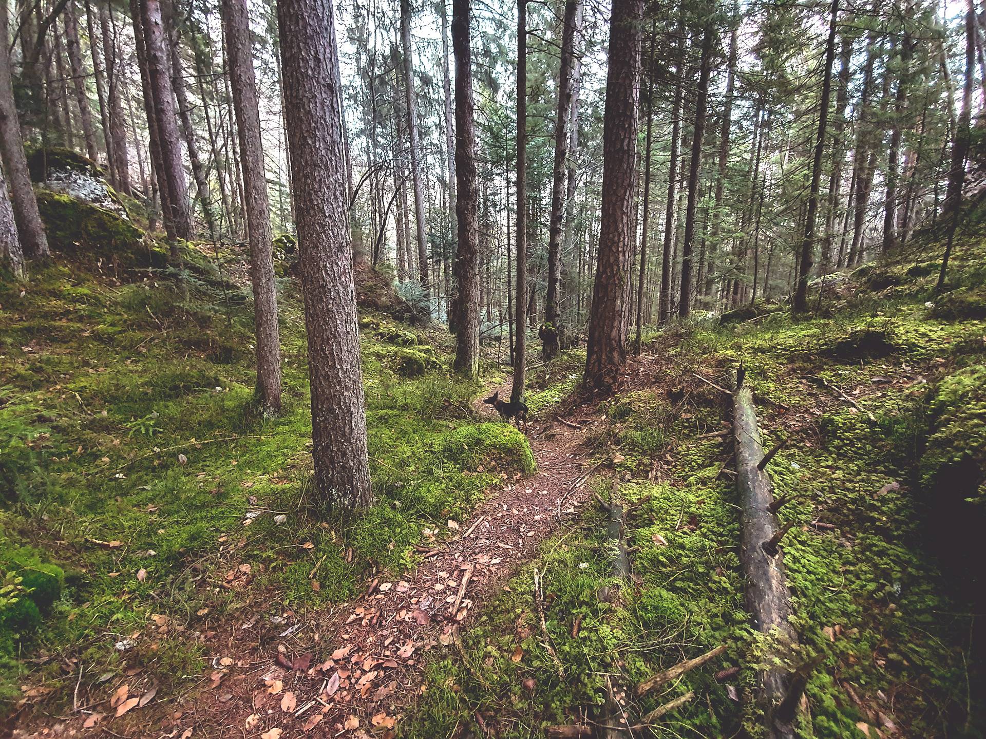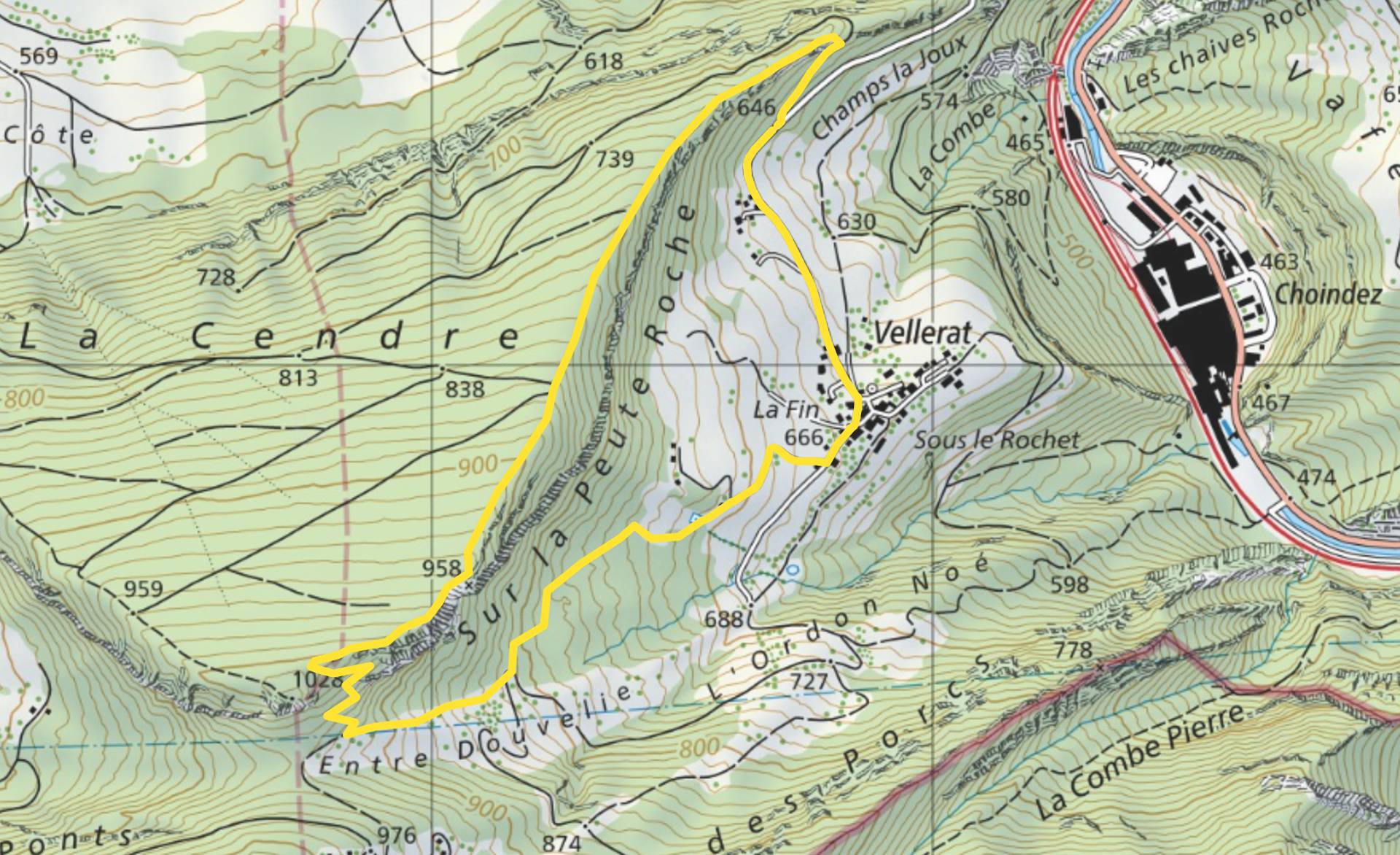 Traverser la route puis suivre le chemin blanc sur 650m. Juste avant le virage qui part à gauche, monter sur la crête (il y a des chaînes sur les 2-3 premiers mètres).