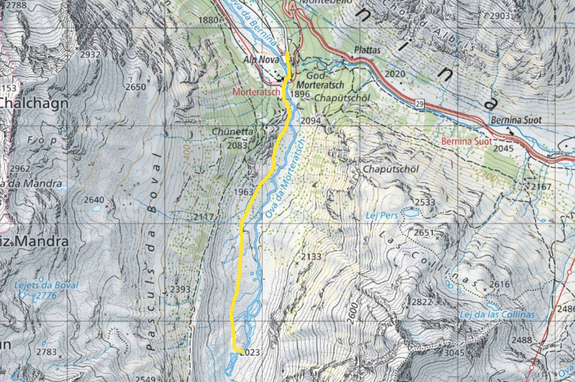 Grand parking disponible un peu avant l’hôtel-restaurant Morteratsch