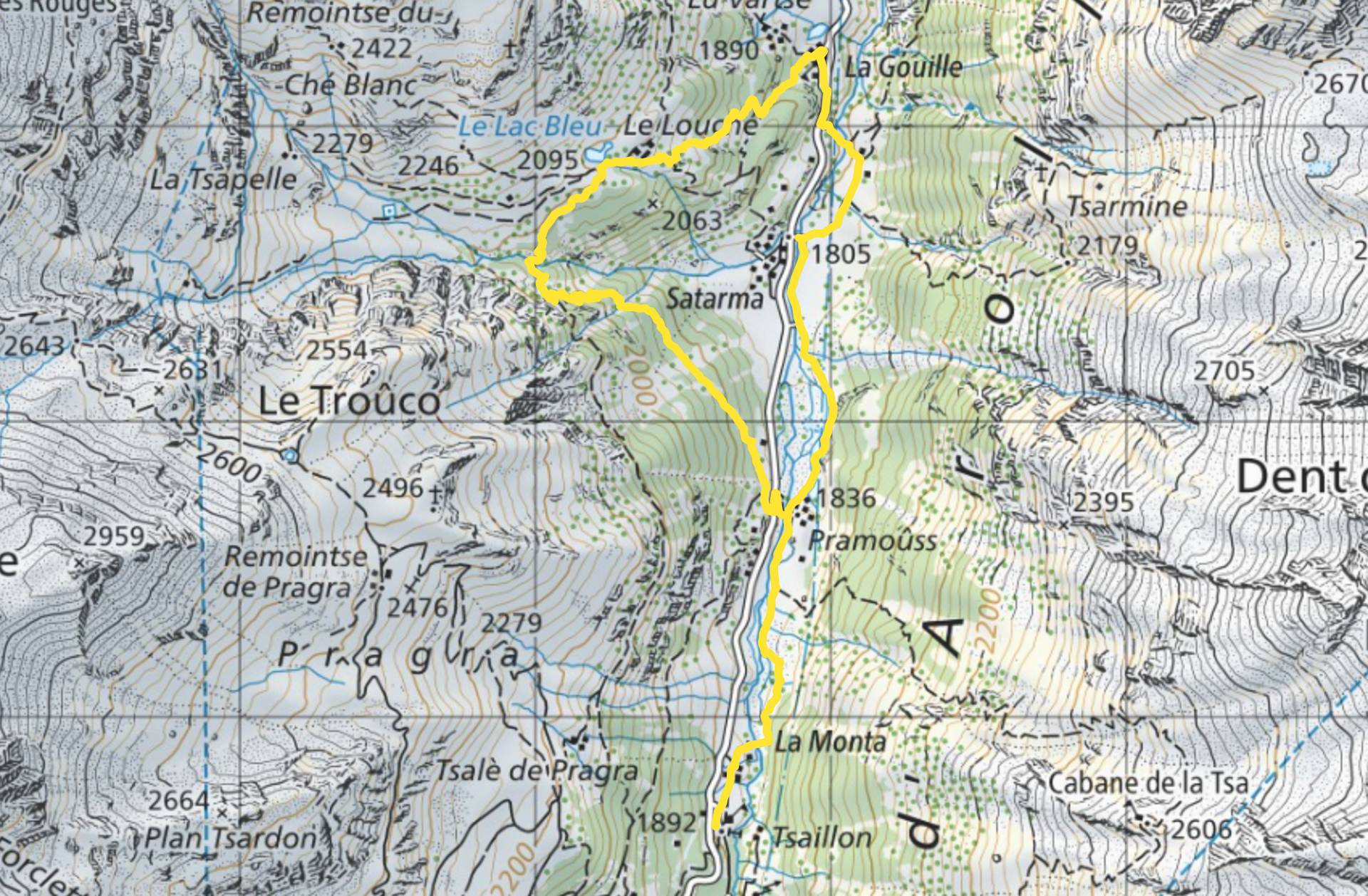 Depuis le parking de l’Hôtel-restaurant de l’Aiguille de la Tsa, situé juste avant le village d’Arolla, très sympathique endroit qui propose notamment des spécialités suisses, valaisannes et régionales ainsi que des spécialités typiques du chef. Les pizzas faites maison constituent un délice supplémentaire. Pour les jours de randonnées en montagne, il est possible d’obtenir, sur demande, un panier repas ou un pique-nique.