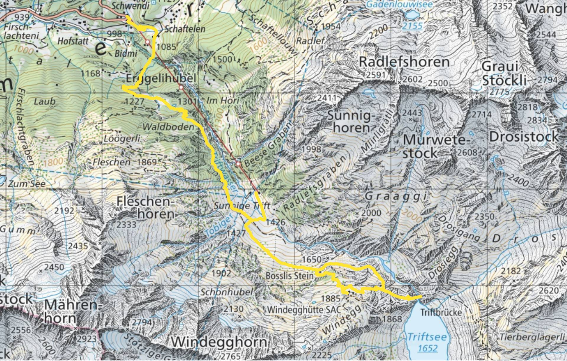 Depuis le parking du lift « Nessental Triftbahn » (Schwendeli sur la carte ci-dessous)