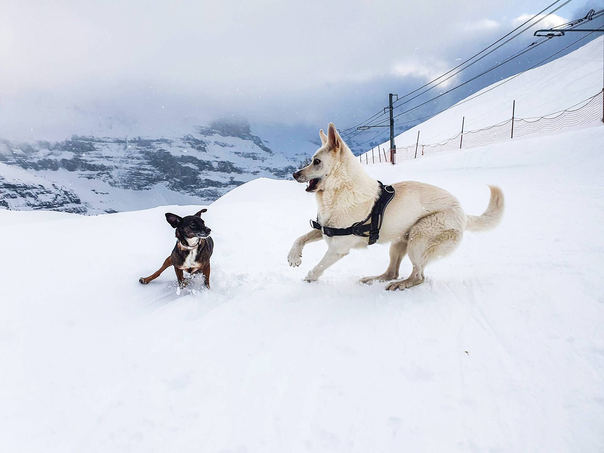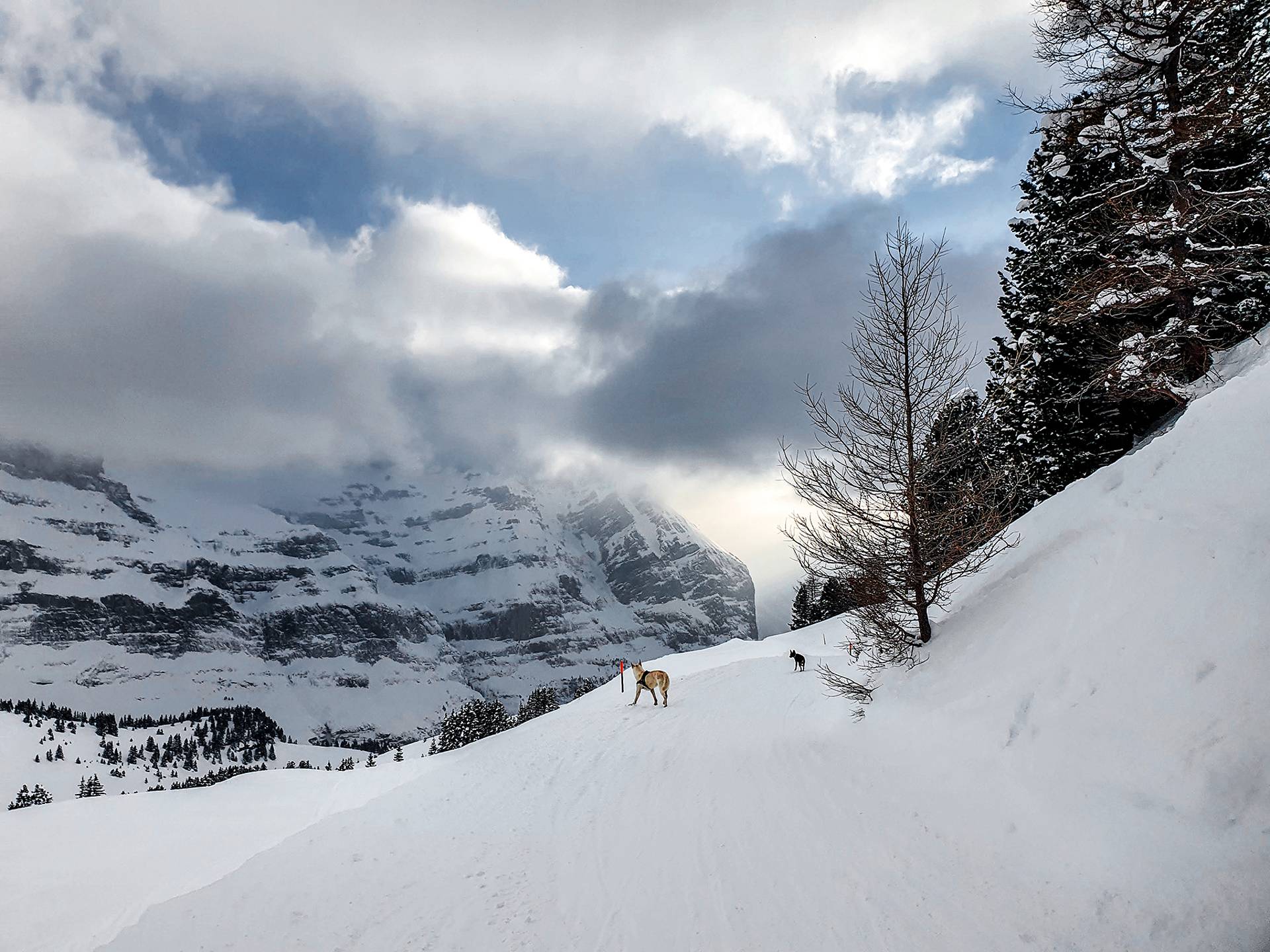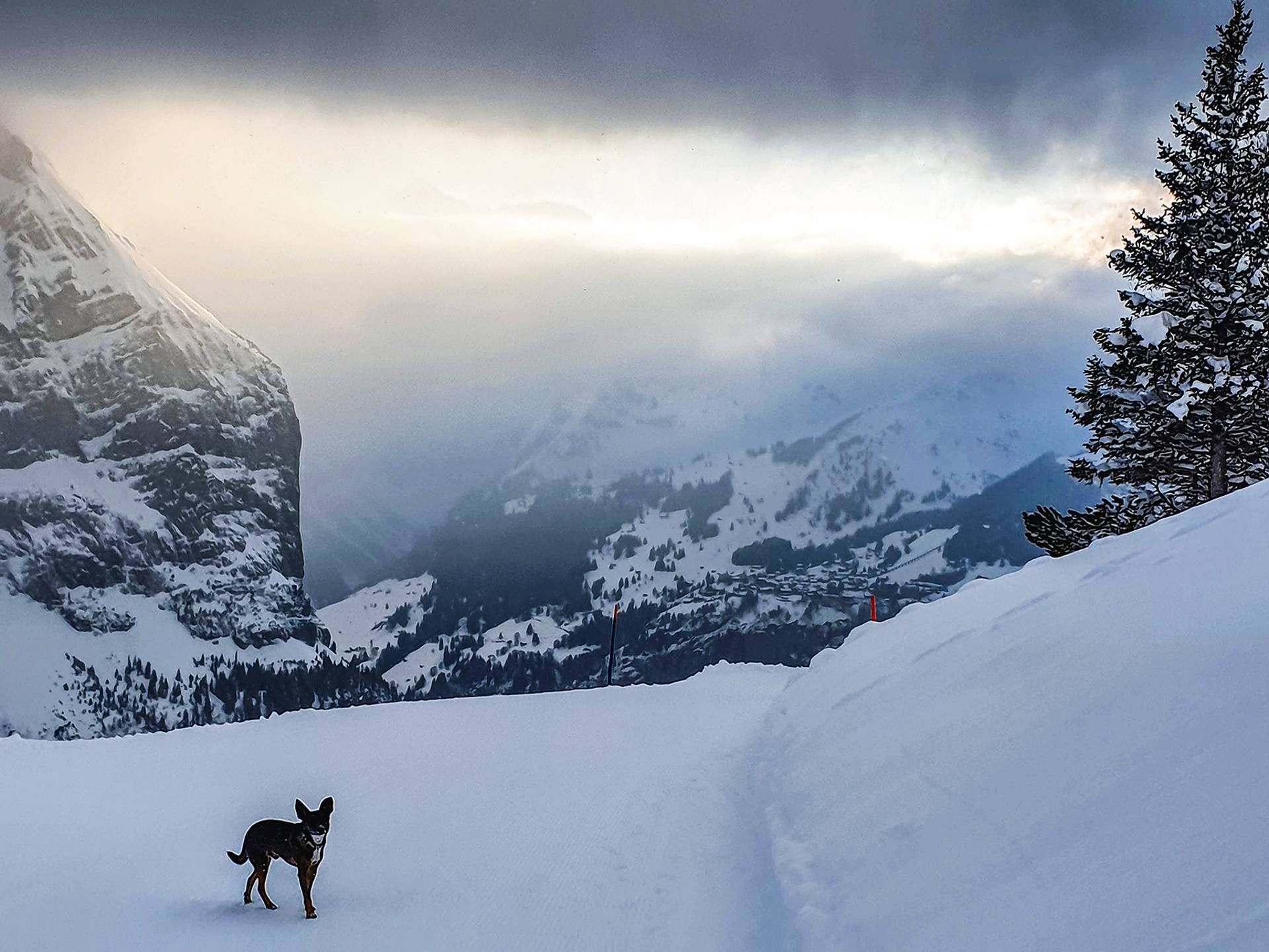 Wengen n’est accessible qu’en train depuis Lauterbrunnen (parking ici). Ma pote, moi et nos deux chiens sommes arrivés en fin d’après-midi à Lauterbrunnen et nous avons pris le dernier train vers la Kleine Scheidegg après une rapide halte à Wengen pour déposer nos affaires dans notre « Air B’nB ». Arrivées au pied des 3 célèbres sommets, Eiger, Mönch, Jungrau, nous étions seules au monde, les derniers skieurs disparaissant rapidement dans les pentes. C’est donc dans un silence absolu que nous avons entamé la descente vers Wengen.