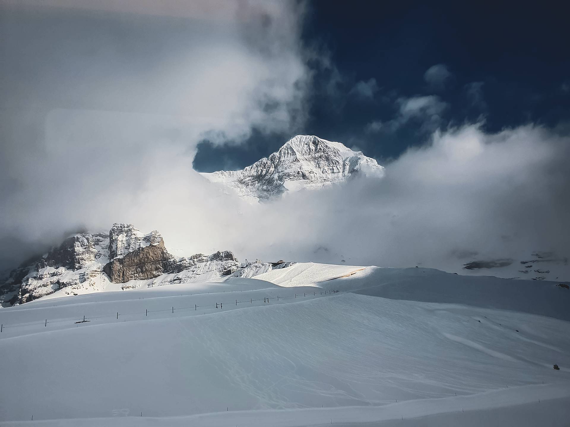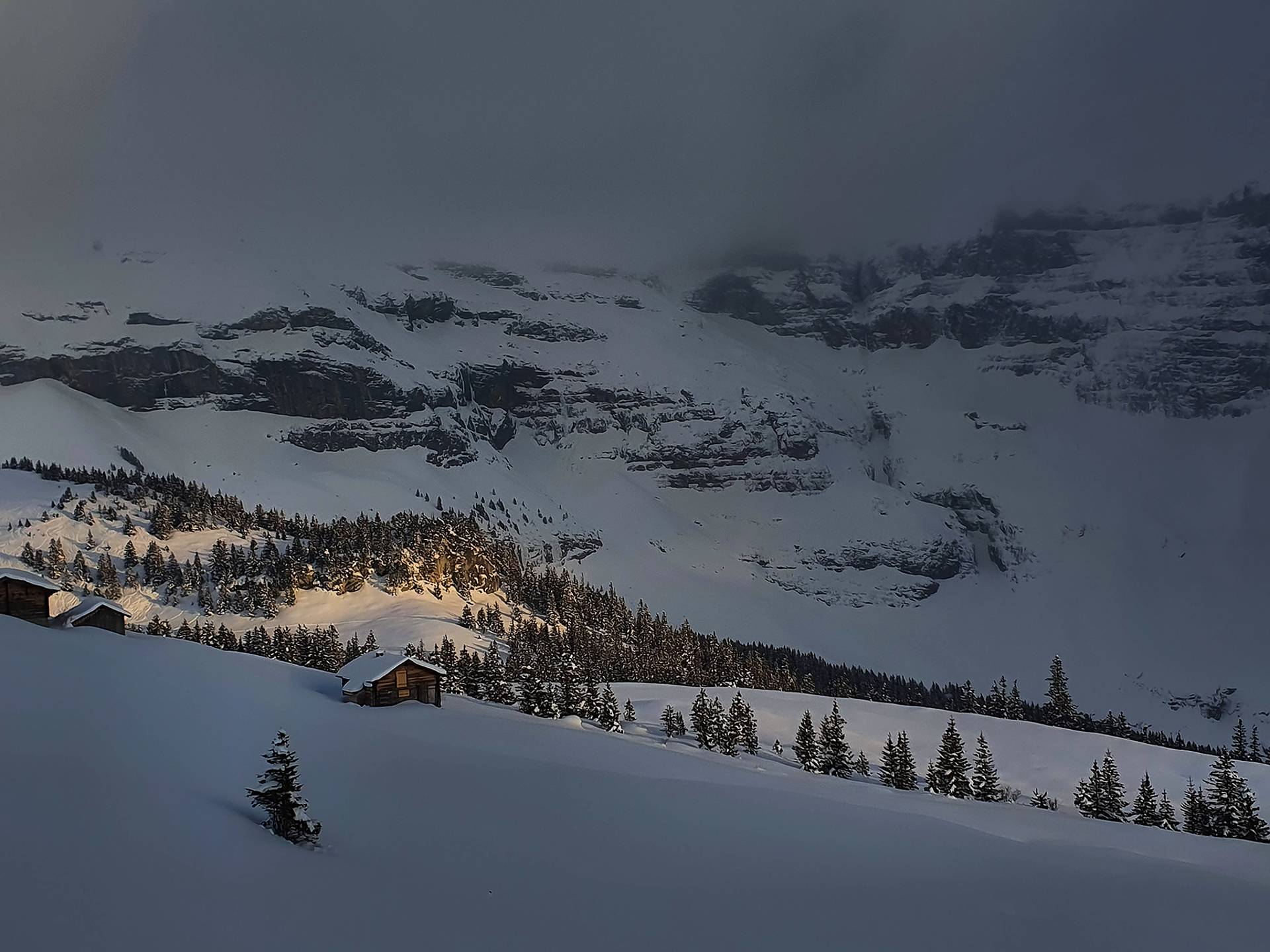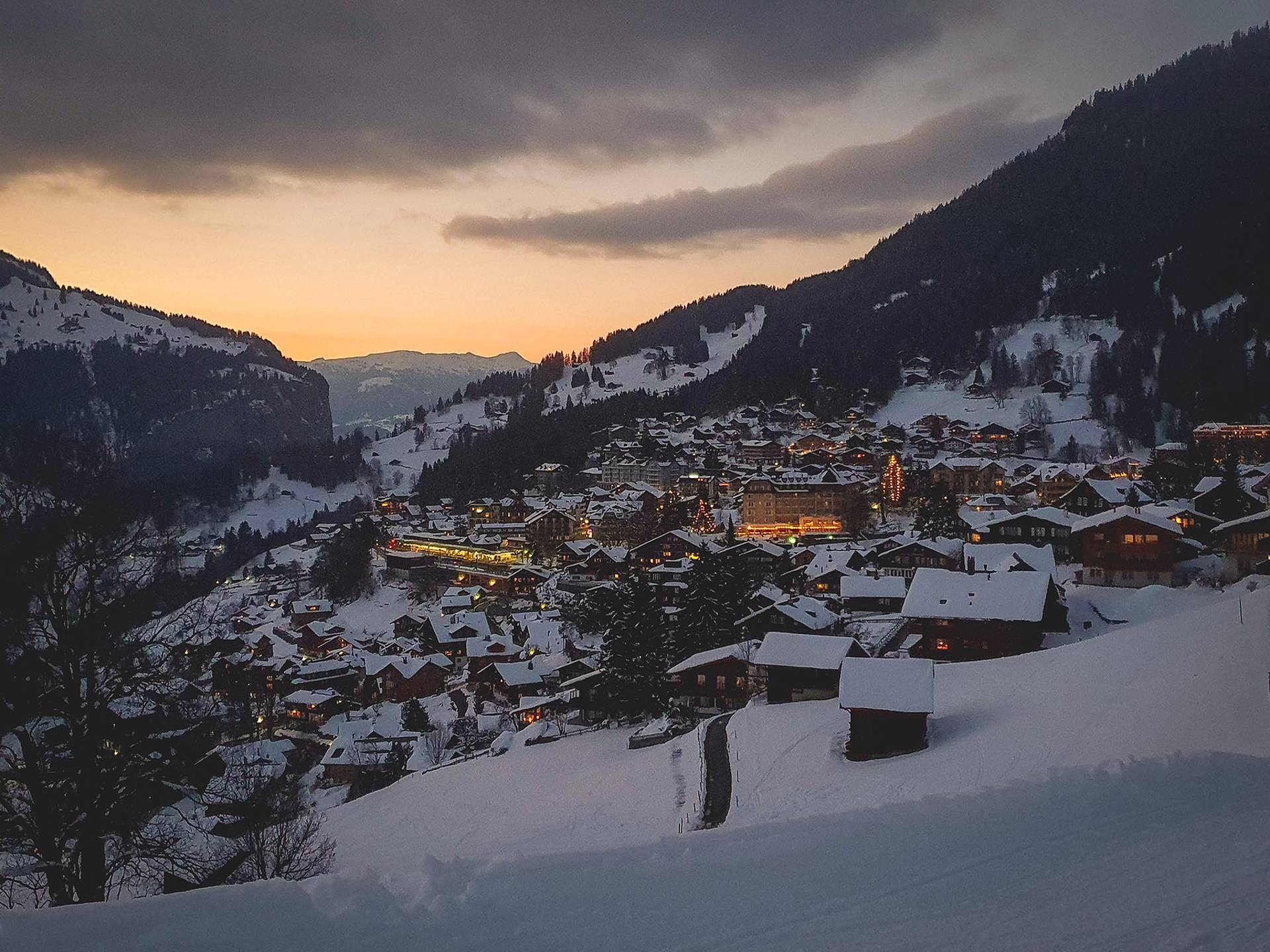 Wengen n’est accessible qu’en train depuis Lauterbrunnen (parking ici). Ma pote, moi et nos deux chiens sommes arrivés en fin d’après-midi à Lauterbrunnen et nous avons pris le dernier train vers la Kleine Scheidegg après une rapide halte à Wengen pour déposer nos affaires dans notre « Air B’nB ». Arrivées au pied des 3 célèbres sommets, Eiger, Mönch, Jungrau, nous étions seules au monde, les derniers skieurs disparaissant rapidement dans les pentes. C’est donc dans un silence absolu que nous avons entamé la descente vers Wengen.