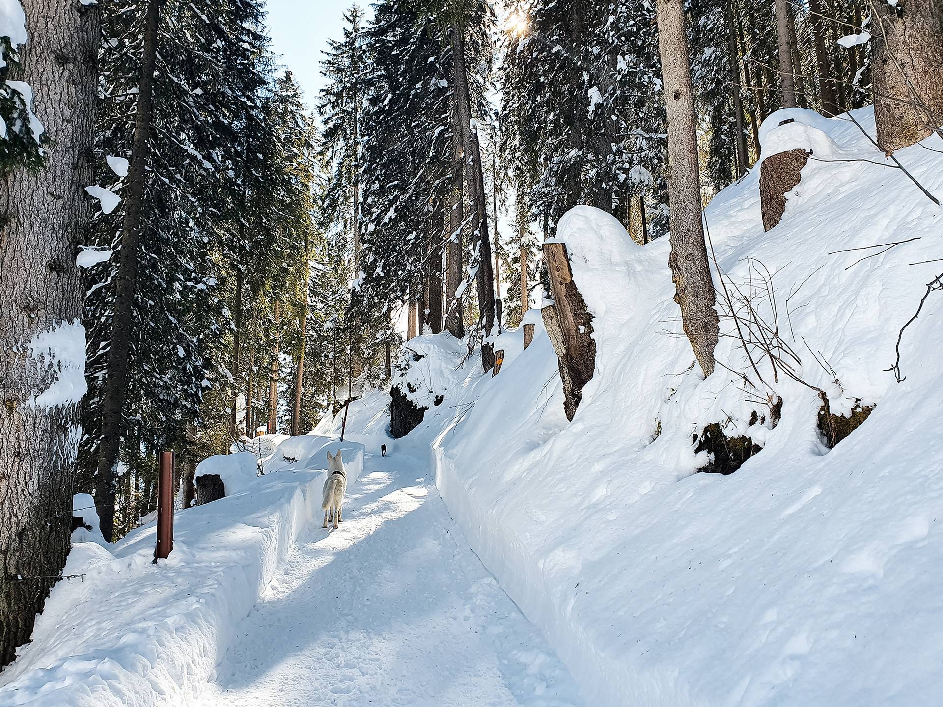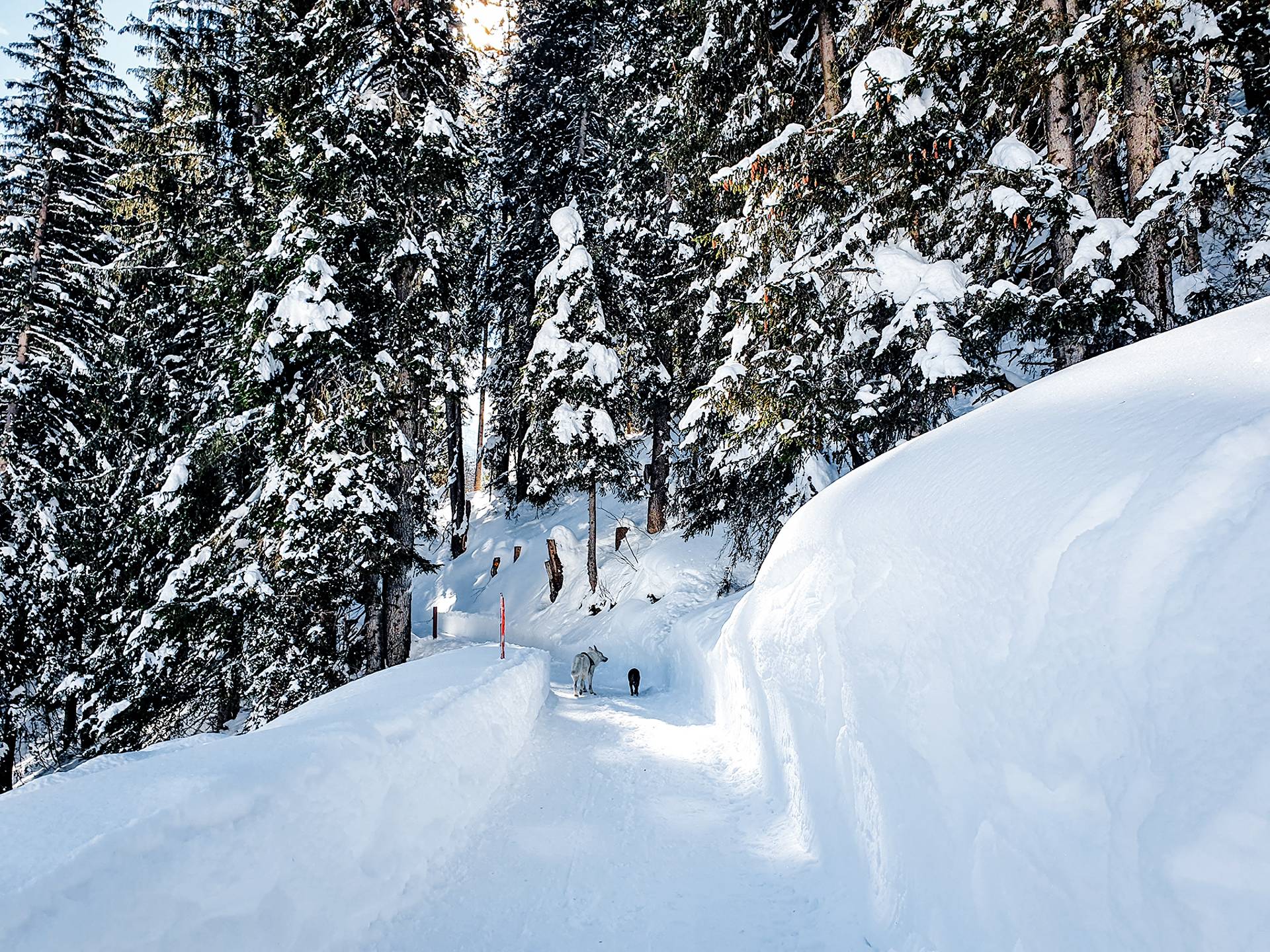 Le chemin suit en partie la piste de ski bleue puis le tracé de la piste de luge. Il est damé, donc large et parfaitement praticable sans raquettes avec de bonnes chaussures. On est loin du sentier d’aventure mais le paysage vaut bien le détour !