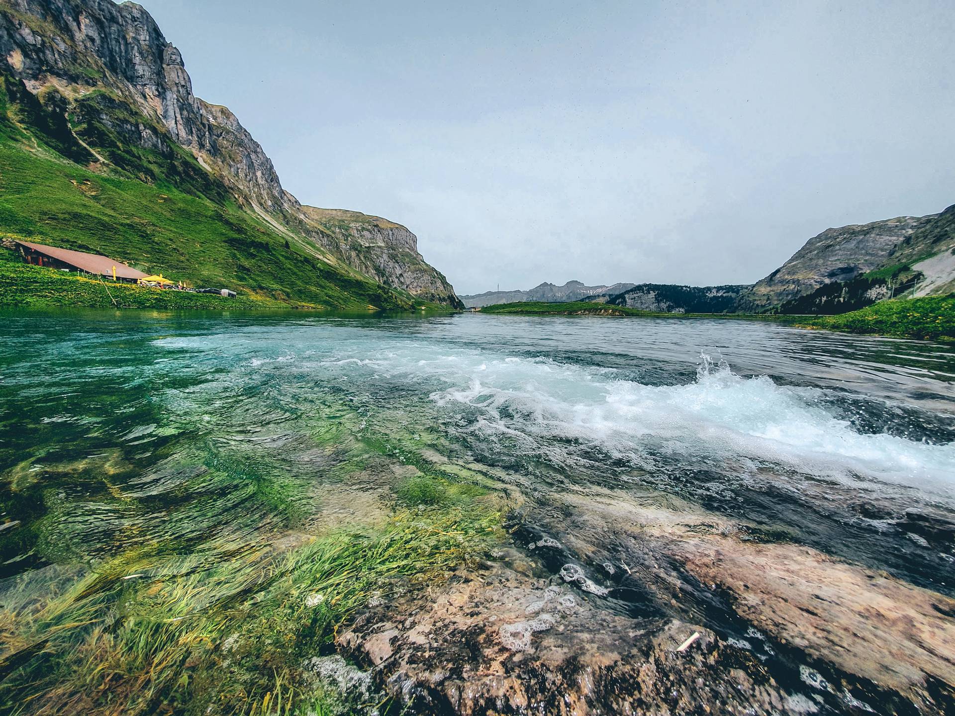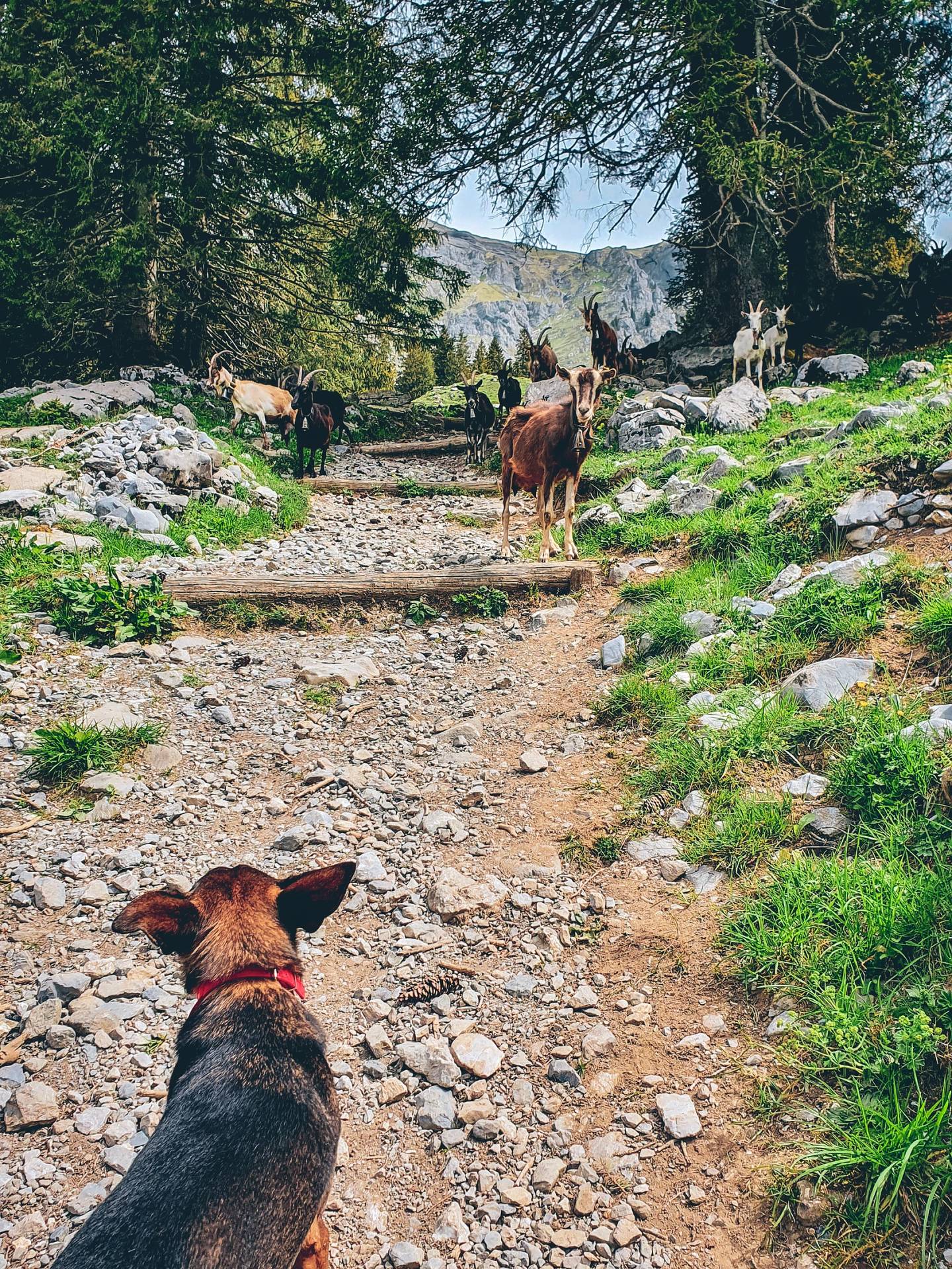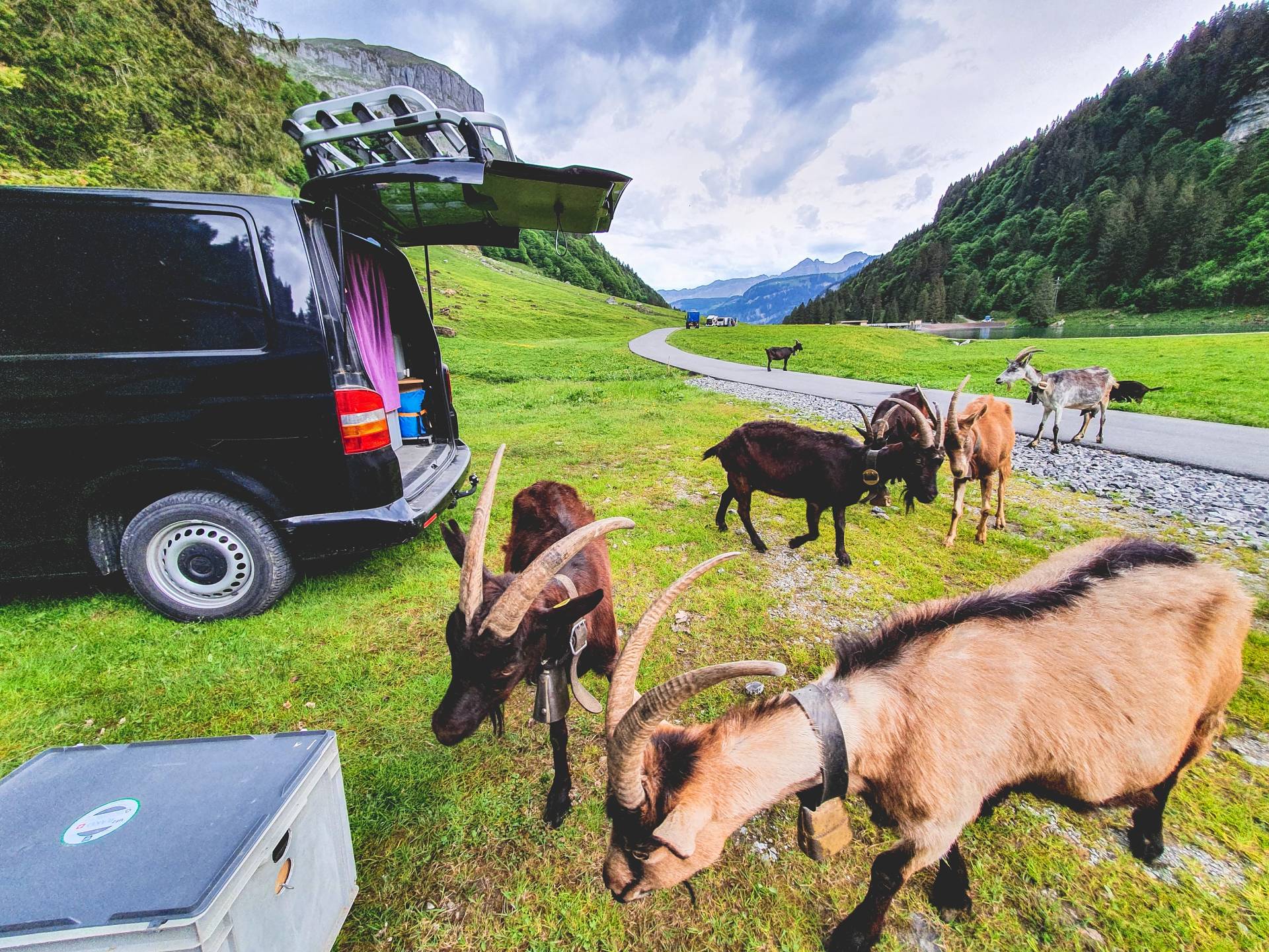 Notre parcours commence au petit lac du bas, où j’ai garé le van comme beaucoup d’autres amateurs. L’environnement est sympa, avec des chèvres très demandeuses de câlins, des petits cochons malicieux et une buvette un peu plus loin pour y boire un Rivella. A savoir également, hors période COVID, une cabine monte de là jusqu’à Glattalp pour accéder au lac de Glattalp. Ca doit être super beau mais je n’ai pas eu l’occasion de m’y rendre. J’aurais voulu y monter à pied, je pense que la randonnée doit être belle. Mais la météo était un peu incertaine et la randonnée, sans prendre le lift, dure entre 5h et 6h, et je n’avais pas le temps à ce moment-là. Ca sera peut-être pour une prochaine !